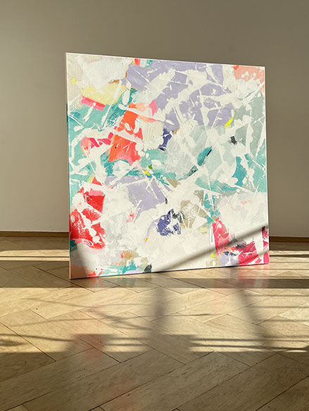 Die Bilder aus der Reihe FLOW und DIAMOND sind auf naturbelassener Baumwolle gemalt – mit Pigment und wenig Binder.